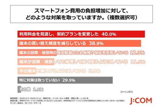 今回の調査により、世帯全体のスマートフォンの費用を負担している人の約9割が、スマートフォンの端末価格の上昇によるスマートフォン関連の費用負担の増加を気にしており、スマートフォン費用の負担増加に対して「契約プラン変更」や端末の長期利用により「端末の買い替え頻度を減らす」といった対策をしている人が多いことがわかりました。