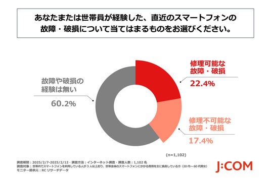 約4割の人が直近で自分または世帯員のスマートフォンの故障・破損を経験している