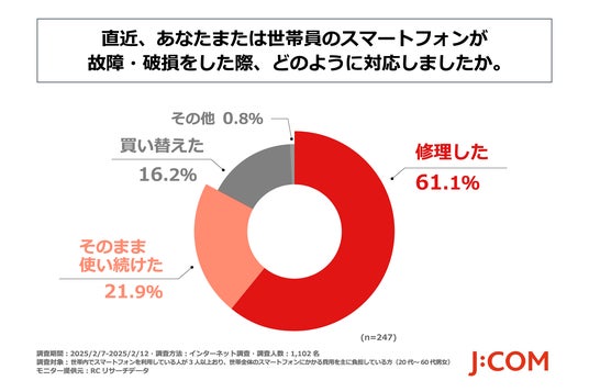 スマートフォンの故障・破損を受けて、6割の人は修理し、2割の人はそのまま使用している