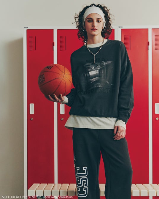 舞台であるムーアデール高校の体操服からインスピレーションされたカレッジ風プルオーバー。