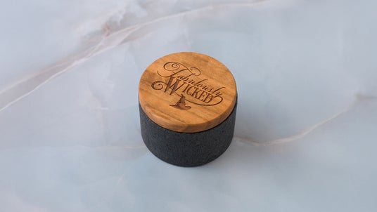 「ウィキッド」のシンボルを刻印した木の蓋と、天然石の美しさが融合したデザインのアクセサリーボックスです。