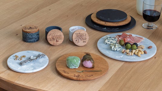 愛知県岡崎市の老舗材木屋と石材店の後継者同士による"アトツギコラボ"で生まれた本作。ミシュラン星付きレストランでも使われる天然石と、高級ホテルのインテリアに採用される銘木を、職人がひとつひとつ手作業で仕上げます。木目や石の模様には個体差があり、どれも世界にひとつだけのもの。100年を超える長い歴史と技術が結集したアイテムは、どこか温かみがあり、使い込むほどに愛着が湧きます。