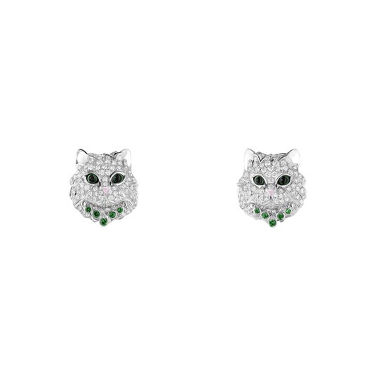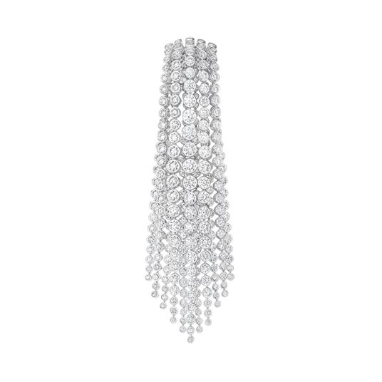 コールマン・ドミンゴは、2024年の夏に発表されたハイジュエリーコレクション「Or Bleu」より、ホワイトゴールドにサイズの異なるダイヤモンドを緻密にセットし、流れ落ちる滝を表現した「フロ」のブローチを、まるでネクタイのように着用。そしてメゾンのアイコンアニマルである黒猫「ウラジミール」のスタッズイヤリングが耳元を彩りました。