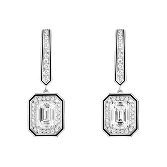 フェリシティ・ジョーンズは黒を基調としたカットワークのドレスに合わせて、エメラルドカットのダイヤモンドとブラックラッカーのコントラストが美しい「ヴァンドーム リズレ」のスリーパーイヤリング、4.10カラットのソリテールリングをセレクト。