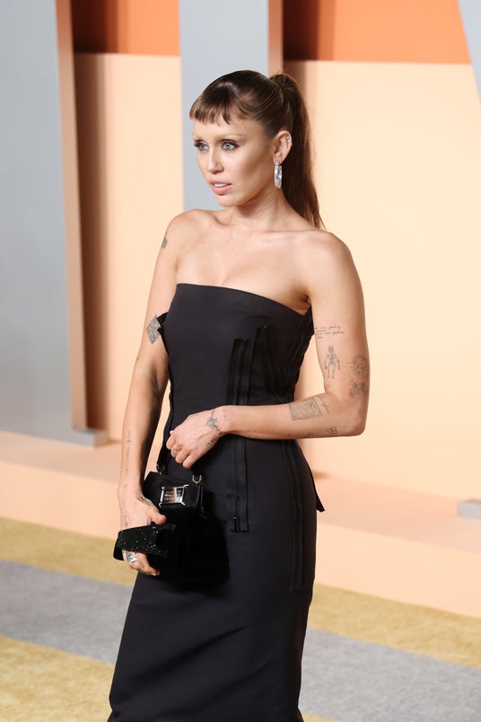 マイリー・サイラスはシンプルなブラックドレス姿で登場。異なるカッティングのダイヤモンドをグラフィカルに配した「キャトル ラディアント」のフープイヤリングと2種類のリングが、シンプルなスタイルに華を添えます。
