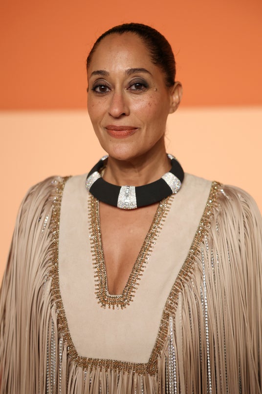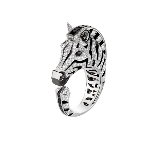 トレイシー・エリス・ロスの首元に輝くのは、2024年発表のハイジュエリーコレクション「Or Bleu」より黒い砂浜と白い波のコントラストを本物の黒砂とダイヤモンドで表現した「サブル ノワール」ネックレス。「プリュム ドゥ パオン」のリングはホワイトゴールド、ダイヤモンド、パールで白い輝きを。「ゼブラ」リングのブラックラッカーやオニキスの瞳が手元でも白と黒のコントラストを演出しました。