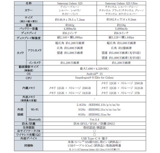 <主な仕様:「Samsung Galaxy S25」、「Samsung Galaxy S25 Ultra」>