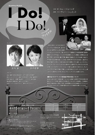 有限会社タチ・ワールド(東京都世田谷区、代表:舘 信行)主催、ブロードウェイ・ミュージカル『I DO! I DO!』が2022年4月15日(金)〜4月17日(日)にウッディシアター中目黒(東京都目黒区)にて上演されます。チケットはカンフェティ(運営:ロングランプランニング株式会社、東京都新宿区、代表取締役:榑松 大剛)にて3月28日(月)10:00より発売開始です。