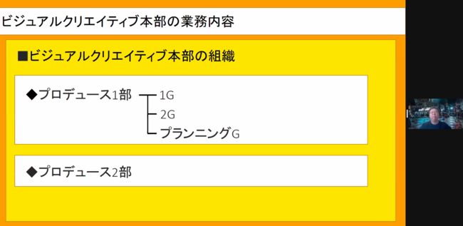そこから、ビジュアルクリエイティブ本部の紹介がスタート。プロデュース1部と2部があり、1部 1Gは、アジアドラマのパッケージ制作や配信、テレビ等の権利運用に携わることがメインのチーム。1部2Gは、邦画、洋画、TVドラマなどをメインに、パッケージ制作や配給、配信、テレビ等の作品の権利運用に携わるチームとのこと。そして、松谷が所属する1部プランニングGは、部全体の宣伝を担当。プロデュース2部は、企画開発に特化したチームでYouTubeや配信コンテンツ、イベント等多様な形のコンテンツを作成しているそうです。