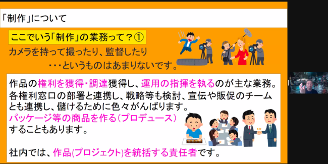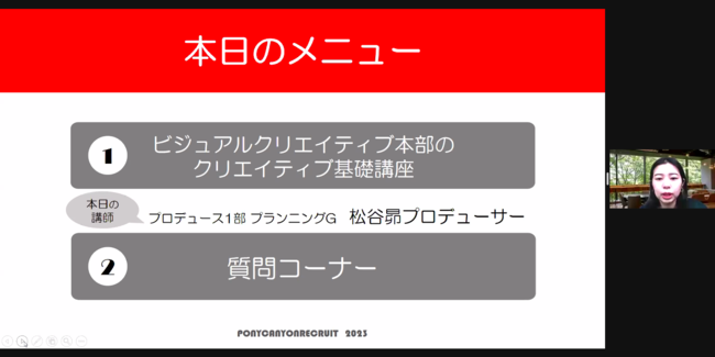 今回は約200名の就活生がオンラインにて参加。まず人事担当者が「実際の仕事内容を理解してもらうのと、入社後の働く姿を明確にイメージしてもらうきっかけにして、今後の就活に役立ててください」と講座の目的を説明。そして、「ポニーキャニオンの松谷です。専門用語も出てきますが、なるべくわかりやすく伝えられたらと思います」とにこやかに登場し、講座がスタート。