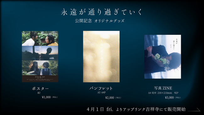 アップリンク吉祥寺を皮切りに全国ロードショーを致します、映画『永遠が通り過ぎていく』の上映が4月1日より14日間に渡ってアップリンク吉祥寺内にて上映されます。上映を記念して劇場内にてオリジナルグッズの販売を致します。