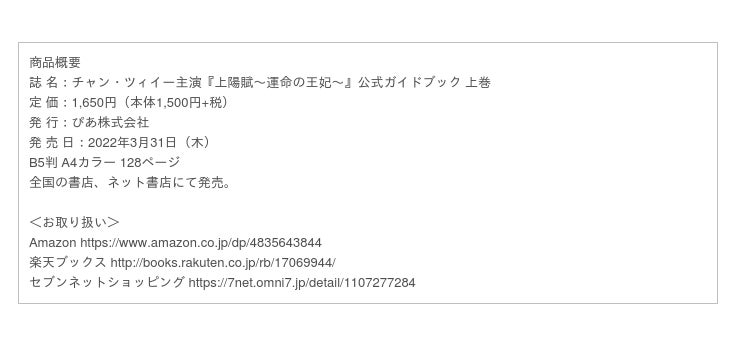 本日3月31日(木)、ぴあ株式会社(本社:東京都渋谷区)より、『チャン・ツィイー主演「上陽賦〜運命の王妃〜」公式ガイドブック上巻』が発売。今春、最も話題の中国時代劇ドラマをまるごと一冊で紹介する公式ガイドブックとなります。