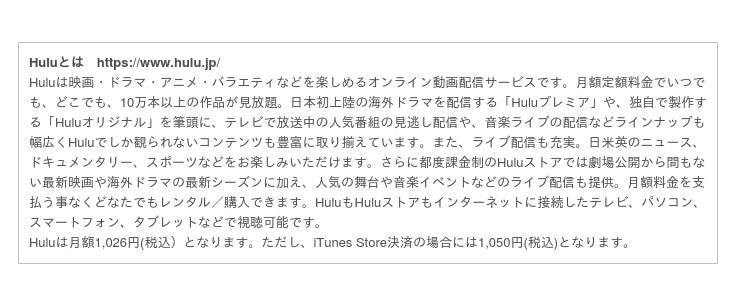 Huluストアは、Huluの月額料金を支払う事なく作品単位での課金方式で、お好きな作品だけを選んでどなたでも視聴できます。