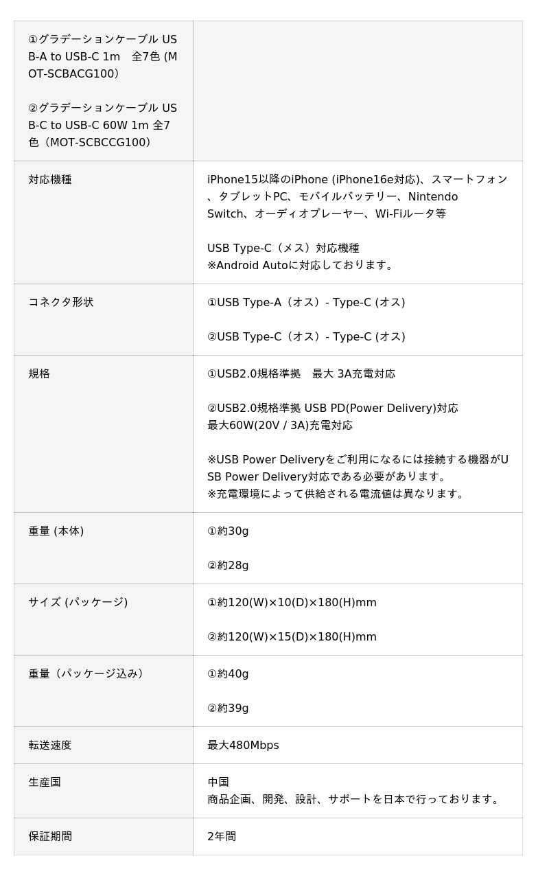 グラデーションケーブル( USB-A to USB-C / USB-C to USB-C 100cm)
