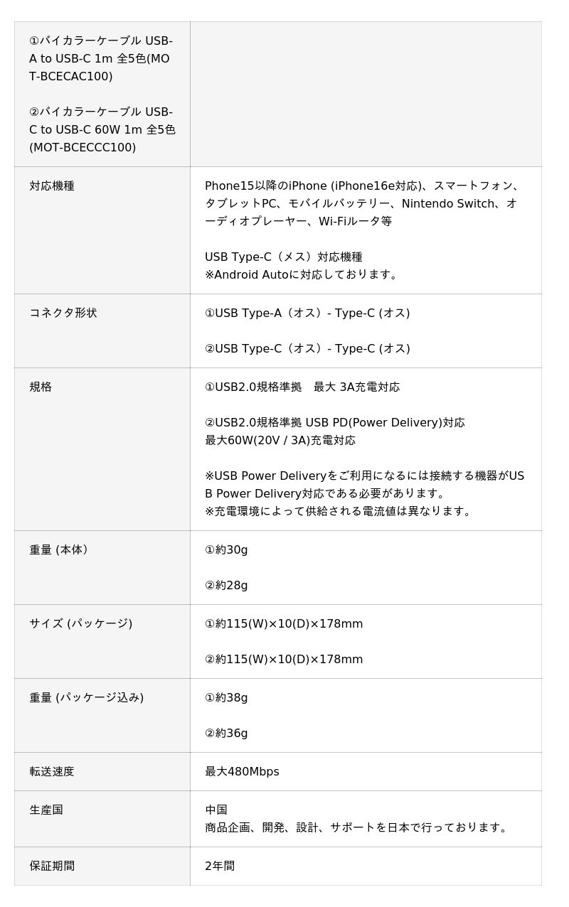 バイカラーケーブル( USB-A to USB-C / USB-C to USB-C 100cm)