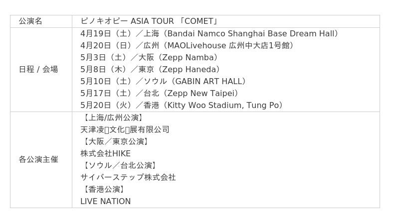 ピノキオピー ASIA TOUR 「COMET」お問い合わせ窓口