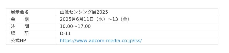 コーンズテクノロジー株式会社(本社:東京都港区、代表取締役社長 西岡和彦)は、2025月6月11日(水)〜13(金)にパシフィコ横浜にて開催される産業用画像機器・画像処理技術に優れた専門性を持つ出展社が一堂に会す展示会『画像センシング展2025』に出展いたします。