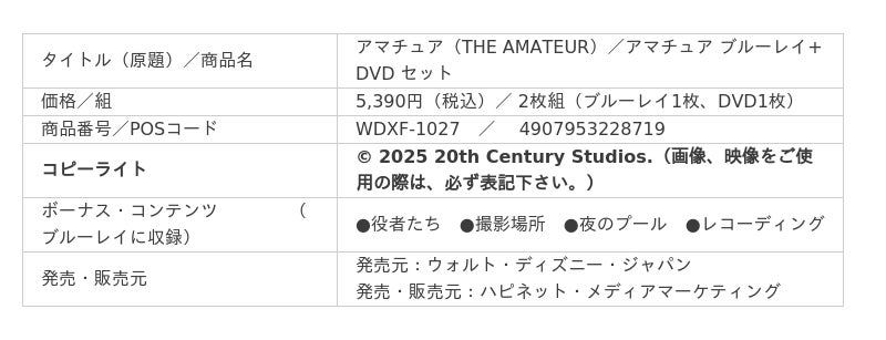 この度発売のブルーレイ+DVDセット、4K UHD+ブルーレイ セット、デジタル配信(購入)には、豪華キャストに迫る「役者たち」を始め、撮影現場やプロダクション・デザインなどにも触れる「撮影場所」、「夜のプール」、「レコーディング」、そして惜しくも本編には収録されなかった「未公開シーン」など、充実したボーナス・コンテンツを収録!冷静な頭脳が暴走する、圧巻のスリルと壮大な復讐劇『アマチュア』を、ぜひブルーレイ+DVD セット、4K UHD+ブルーレイ セット、デジタル配信(購入/レンタル)で、お楽しみください!