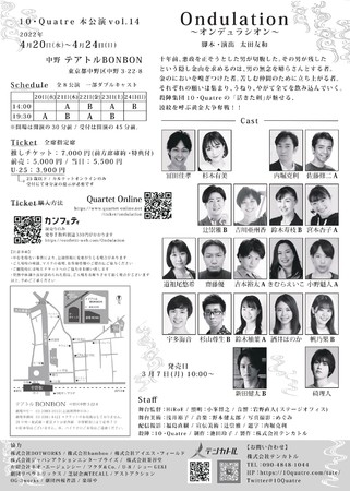 10・Quatre(東京都練馬区、代表:内堀克利)主催、10・Quatre 本公演vol.14『Ondulation 〜オンデュラシオン〜』が2022年4月20日 (水) 〜2022年4月24日 (日)にテアトルBONBON(東京都中野区)にて上演されます。チケットはカンフェティ(運営:ロングランプランニング株式会社、東京都新宿区、代表取締役:榑松 大剛)にて発売中です。