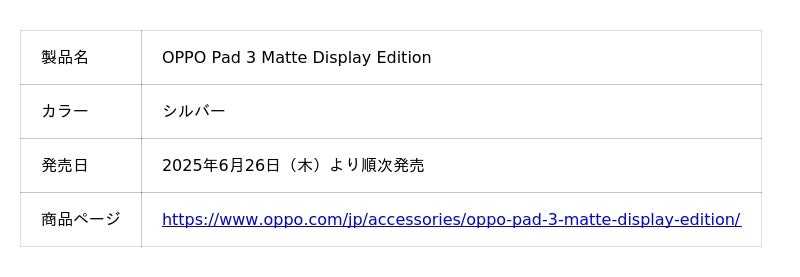 革新的なデザインとテクノロジーで業界をリードするスマートデバイスブランドOPPOは、タブレット新製品「OPPO Pad 3 Matte Display Edition(オッポ パッド スリー マット ディスプレイ エディション)」を一部販売チャネルにて、6月19日(木)13時より予約受付を開始し、6月26日(木)より順次販売を開始いたします。