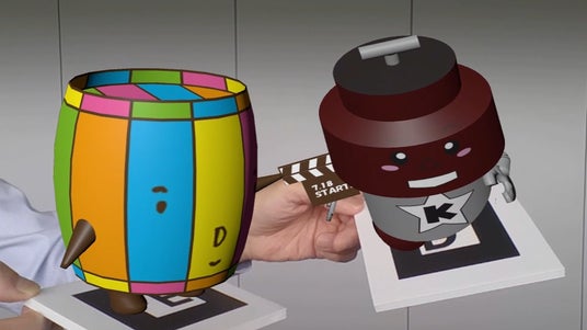 キッズも体験!最新映像のカタチNHK財団制作のARを活用したファミリー向けコンテンツバーチャルパペット「てのひらきゅぽらん」と「てのひらデジたるくん」の体験型展示。