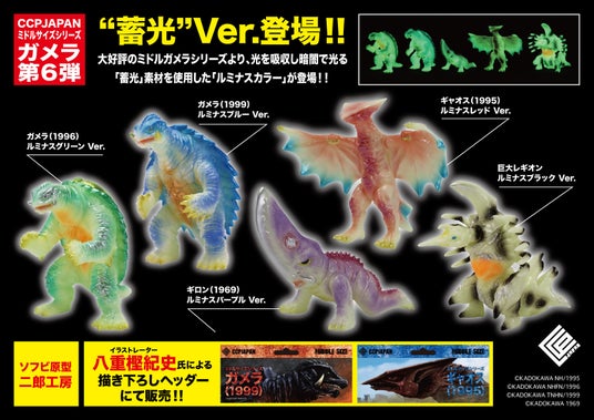 レトロソフビデザインのガメラ、ギロン、ギャオス、巨大レギオンが『蓄光』をテーマに、CCPJAPAN ミドルサイズシリーズ ガメラ【第6弾】として全5種で登場!