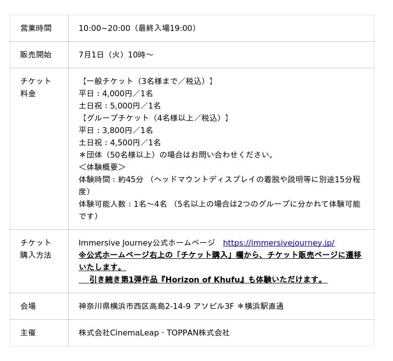 株式会社CinemaLeap(本社:東京都品川区、代表取締役:大橋哲也、以下:当社)が運営する大型 XR(クロスリアリティー)※エンタテインメント施設「IMMERSIVE JOURNEY」(イマーシブジャーニー)は、7月18日(金)より、「Horizon of Khufu」に続く、2作品目となる『Tonight with the Impressionists Paris 1874 -印象派画家と過ごす夜-』を公開いたします。公開に先駆けて7月1日よりチケットを、公式ホームページより販売開始いたします。なお、第2作公開後も、第1弾作品『Horizon of Khufu』を引き続きご体験いただけます。詳細は公式HPにてご確認ください。