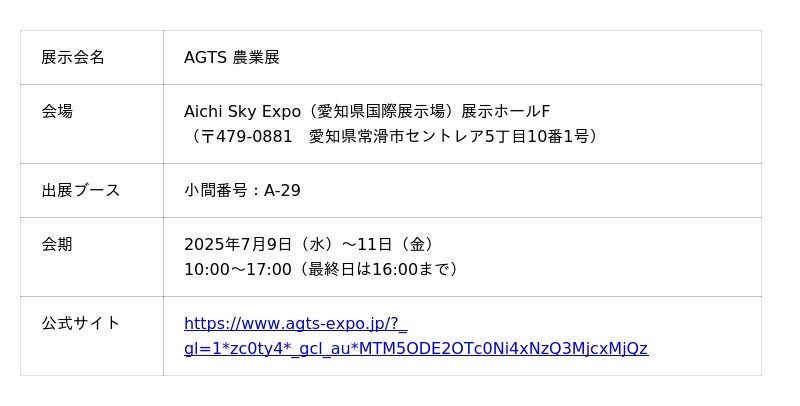 2025年7月9日(水)〜11日(金)に「Aichi Sky Expo」で開催される東海地域で初開催の農業・畜産従事者にむけた展示会です。