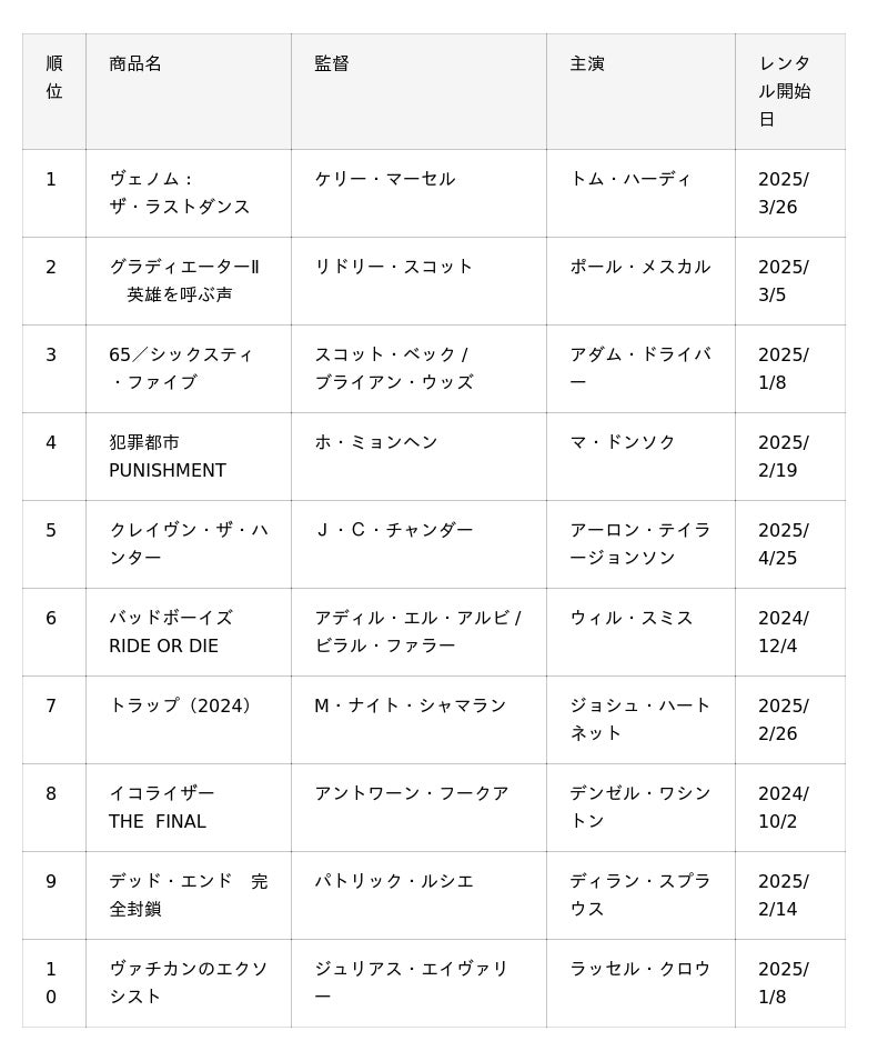 洋画のランクインは総合トップ10では『ヴェノム:ザ・ラストダンス』1作品に留まりましたが、下半期も話題作が次々とレンタル開始を控えています。ぜひ楽しみにお待ちください。