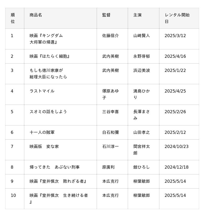 【2025年上半期】ゲオ レンタル映像 貸出数量ランキング レンタル映像総合1位は「映画『キングダム 大将軍の帰還』」