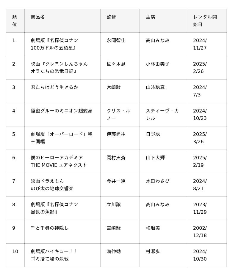 株式会社ゲオホールディングス(本社:愛知県名古屋市中区、代表取締役社長執行役員:遠藤結蔵)のグループ会社、株式会社ゲオストア(本社:愛知県名古屋市中区、代表取締役社長:濱野敏郎)は、2025年1月1日から2025年6月15日まで、全国のゲオショップで取り扱ったBD・DVDの貸出数量を集計し、「【2025上半期】ゲオ レンタル映像貸出数量ランキング」として発表します。なお、対象となる店舗数は約900店舗です。