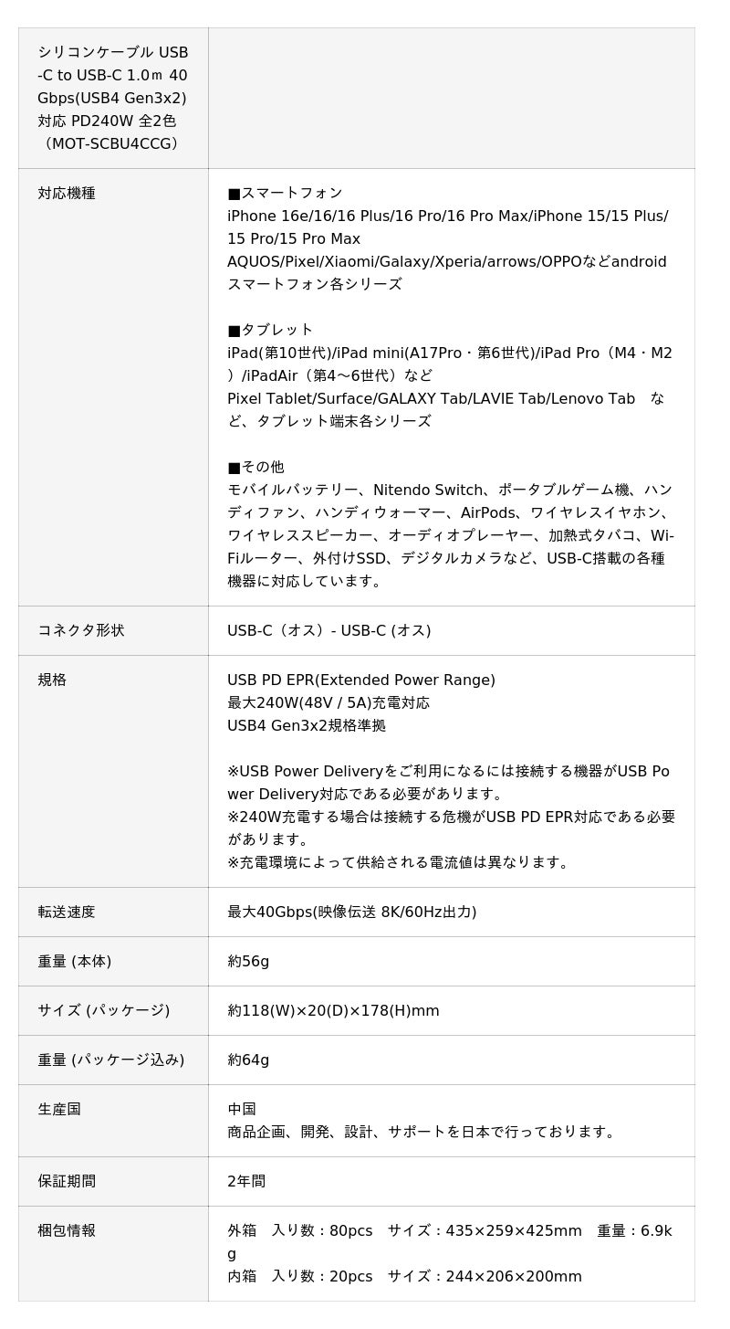 シリコンケーブル USB-C to USB-C 1.0m 40Gbps(USB4 Gen3x2)対応 PD240W 全2色 2年保証(MOT-SCBU4CCG)