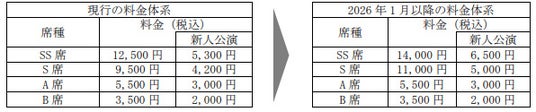 宝塚歌劇公演におきましては、物価上昇等の影響により、公演制作にかかわる各種資材の調達コストや劇場の運営・維持更新コストが以前に比して大幅に増加しております。当社といたしましては、2009年以降、消費税率の変更に際して座席料金を一部改定したものの、長年にわたり、座席料金を据え置くべくさまざまな努力工夫を重ねてまいりました。しかしながら、近年急激な物価高騰が続く中、現行の座席料金を維持することは非常に困難な状況となっており、引き続き宝塚歌劇として華やかでオリジナリティのある作品をお届けできるよう、2026年1月より座席料金の一部改定をお願いすることとなりました。