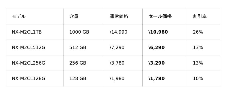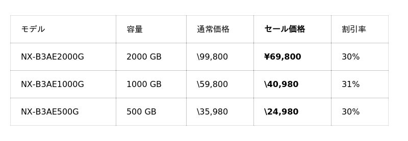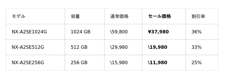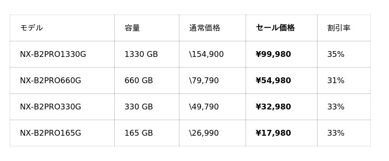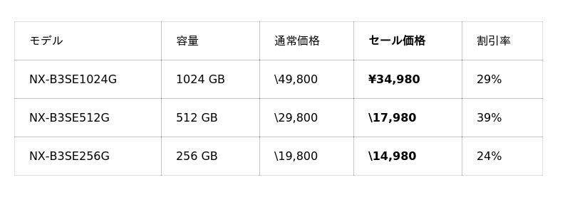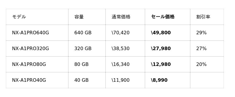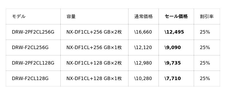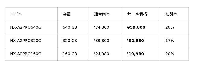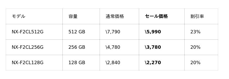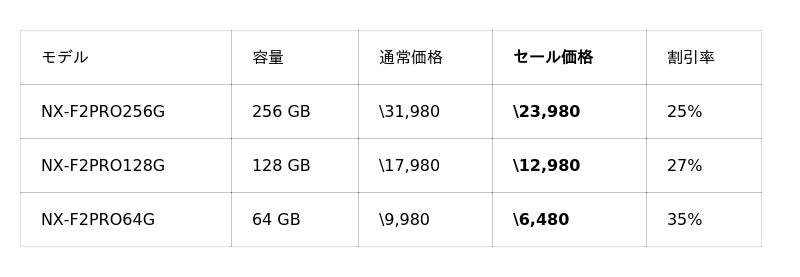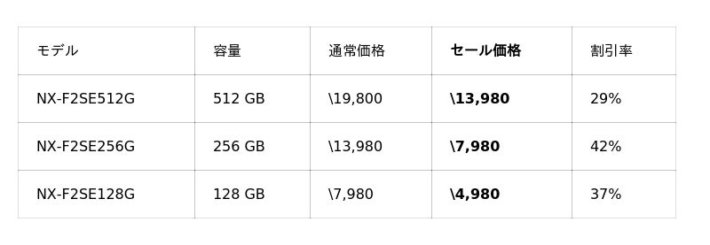 また、カメラの連写機能を最大限に引き出す「NX-F2PROシリーズ」や、静止画・動画ともにマルチにお使いいただける「NX-F2SEシリーズ」など、ご好評いただいているSDXC UHS-IIメモリーカードが最大42%OFFと、今年一番の割引率となっております。