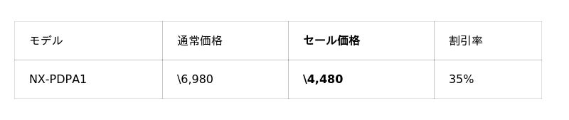 プライムデーでは、超小型軽量のプロジェクターNX1を51%OFFの¥18,000でご提供します。また、スマホなどのデバイスで、ホストデバイスと接続機器に同時給電をしながら、投影などのデータ出力まで行うPDPアダプターに加え、当社製ポータブルSSD NX-P2SEシリーズを接続しながらiPhoneの背面にPDPアダプターをセット可能なMagSafe対応PDPアダプター専用ケースもセール価格にて販売いたします。