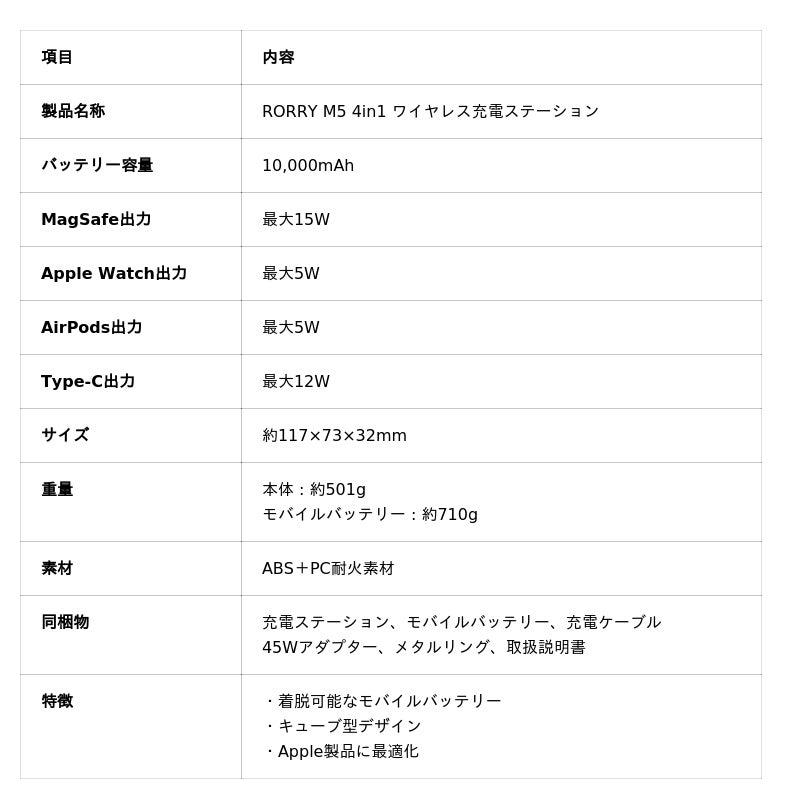 RORRY 4in1充電器は、iPhone、Apple Watch、AirPods と、さらに USB-C 有線ケーブルも同時に充電できる 4in1 ワイヤレス充電ステーションです。特徴をざっくりまとめると以下のとおり。