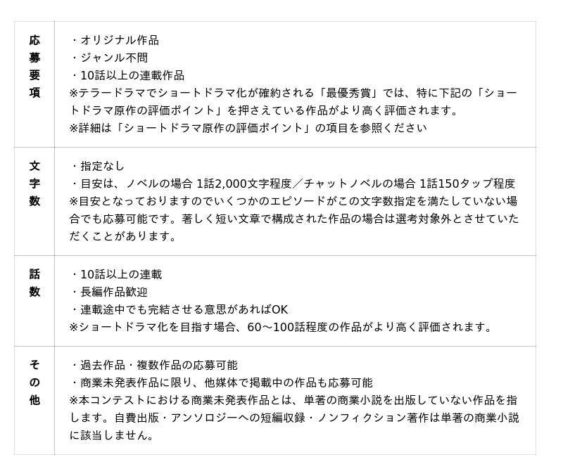 2025年3月にローンチした縦型ショートドラマ**プラットフォーム「テラードラマ」を運営するテラーノベルでは、小説を原作としたコミカライズだけでなく、ショートドラマ化のプロジェクトを強化しています。それぞれの賞にぴったりの作品のご応募をお待ちしております。