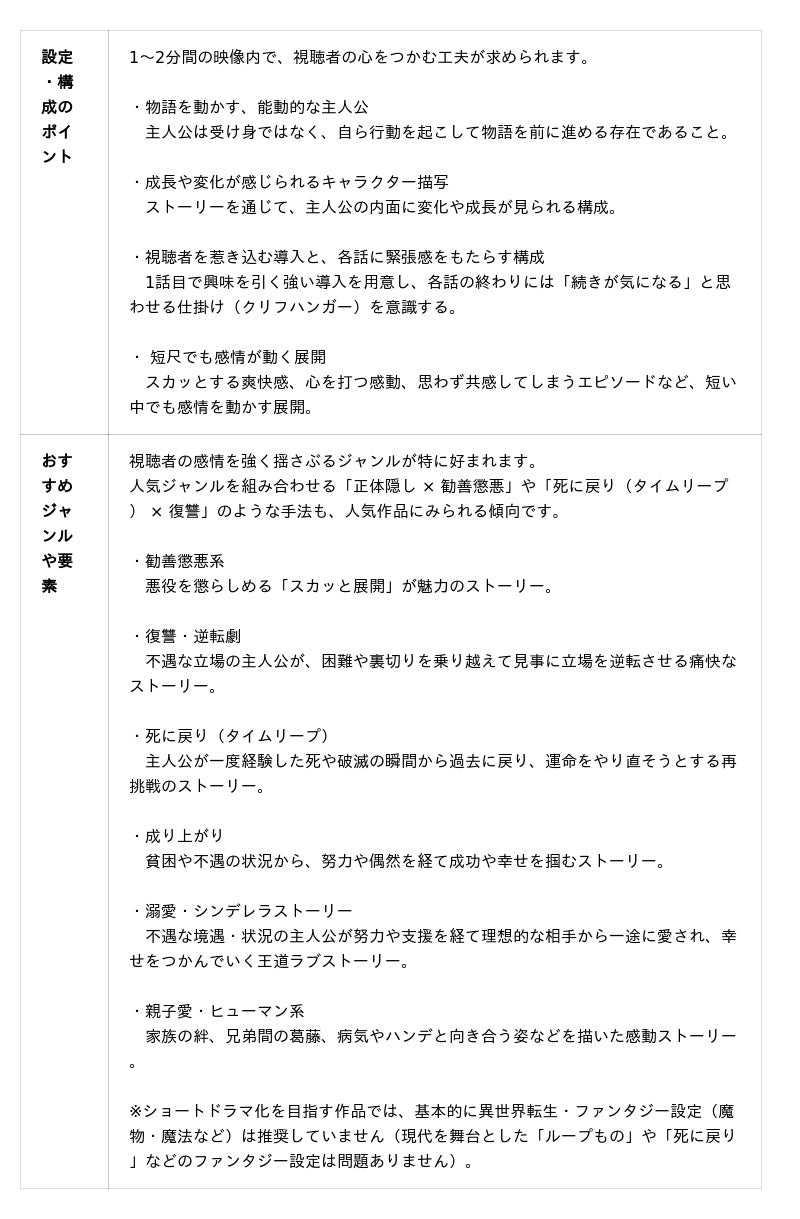 ショートドラマ化を視野に入れた作品では、人気ジャンルを取り入れたインパクトのあるストーリーを歓迎します。