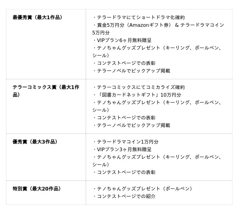 受賞者には最大10万円分の図書カードネットギフトやAmazonギフト券 5万円分、「テラーノベル」VIPプランの最大6ヶ月間無料贈呈、「テラードラマ」で使えるコイン最大5万円分の無料贈呈などを用意しています。