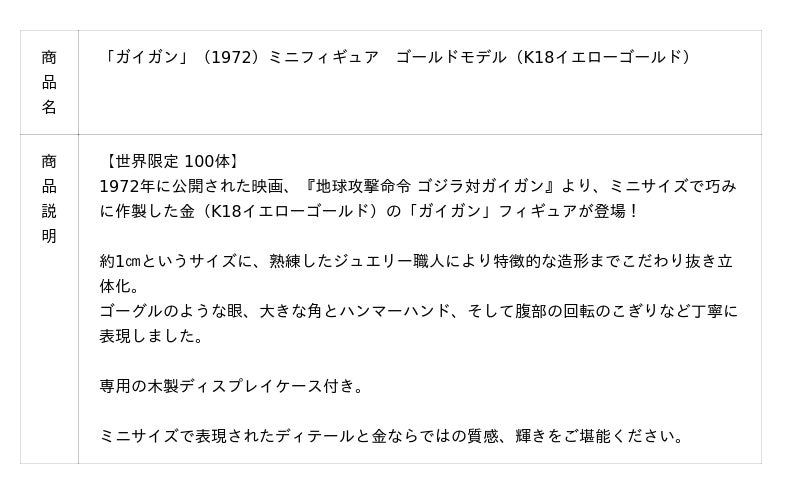 「ガイガン」(1972)ミニフィギュア!「ガイガン」の魅力をK18イエローゴールドで表現。世界限定100体、8月18日(月)まで予約受付