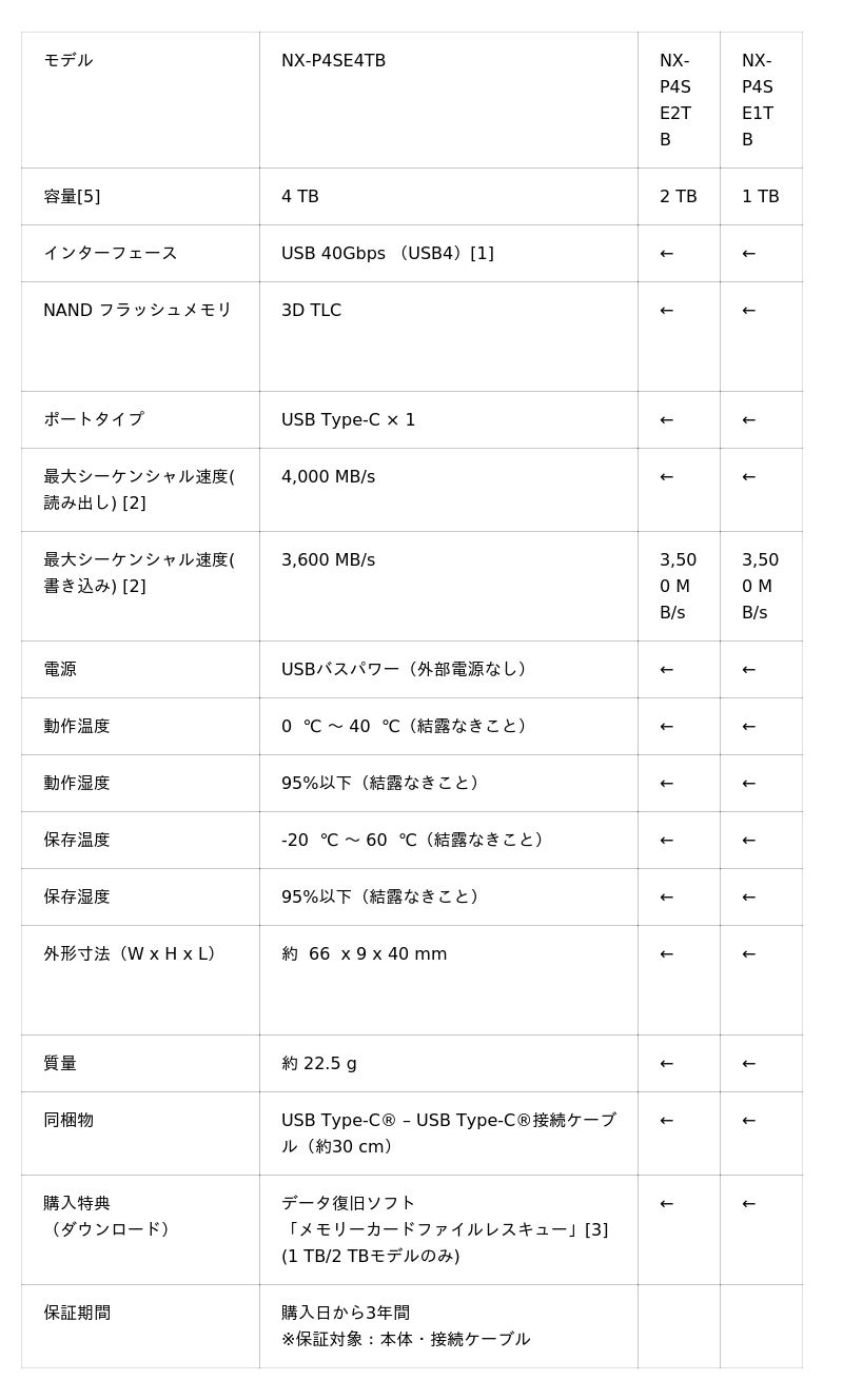 NX-P4SEシリーズは、小型・軽量で多くの方にご支持をいただいている「NX-P2SEシリーズ」のサイズはそのままに、USB 40Gbps(USB4)[1]を採用。最大転送速度は読み出し4,000 MB/s、書き込み3,600 MB/s[2]という高速性能を実現しました。