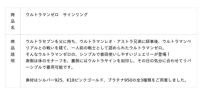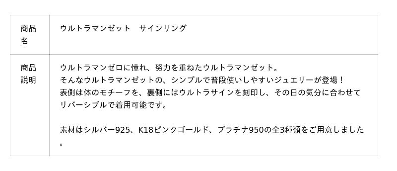 このたびの新作は「ウルトラマンゼロ」と「ウルトラマンゼット」それぞれの体のモチーフを表側に、裏側にはウルトラサインを刻印したリバーシブルタイプのネックレスです。素材はシルバー925、K18ピンクゴールド、プラチナ950の全3種類。