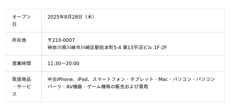 株式会社じゃんぱら(本社:東京都千代田区、代表取締役:小林 直純)が展開するスマホ・パソコンの買取・販売「じゃんぱら」は、「じゃんぱら川崎駅前店」を2025年8月28日(木)にグランドオープンいたします。