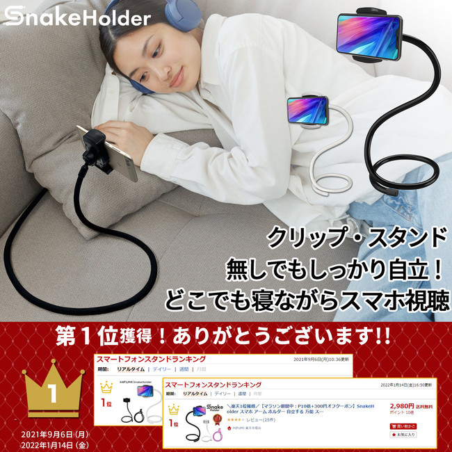 【楽天 お買い物マラソン】万能スマホアームホルダー「SnakeHolder」と、高さも角度も自由自在の「伸縮スマホ&タブレットスタンド」が【ポイント10倍】に!