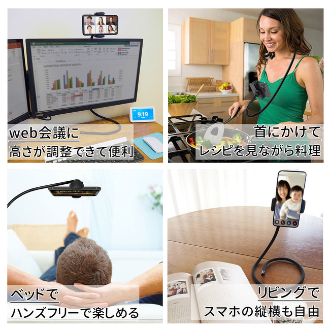 ・長さ94cmのシリコン製フレキシブルアームを自由に曲げて自立させるスマホスタンド。