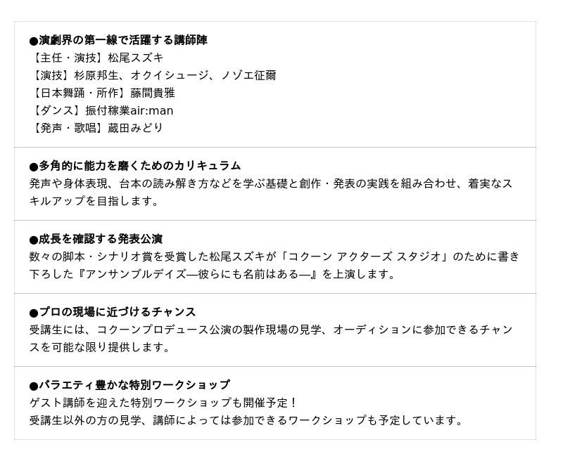 講師陣は第1期、第2期に引き続き、第一線で活躍するシアターコクーンゆかりの方々が担当します。演技はもちろん、歌やダンス、パントマイム、時代劇の所作など、実践・発表も交えながら1年間のカリキュラムを経て、演劇で求められる様々なスキルの習得を目指します。