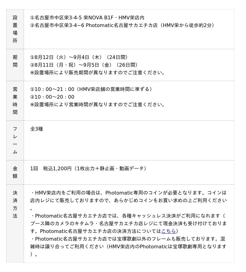 ※1 設置場所により販売期間が異なりますのでご注意ください。Photomatic 名古屋サカエチカ店は、8月11日(月・祝)から撮影が可能です。