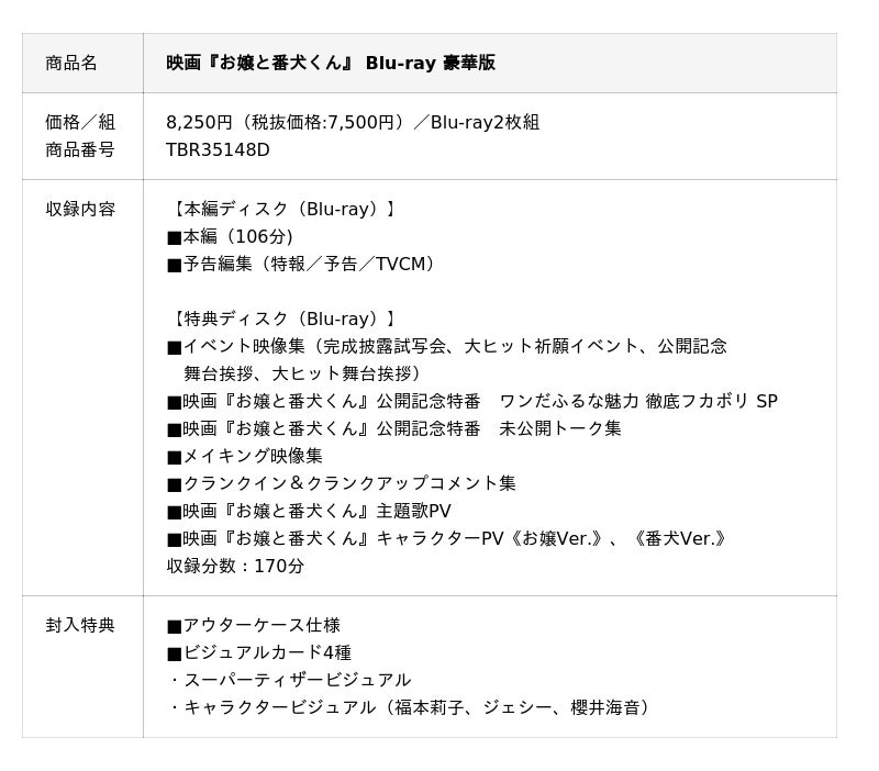 Blu-ray豪華版は、イベント映像集や公開記念特番での未公開トーク、クランクイン&クランクアップコメント集などの映像特典をたっぷり収録した豪華2枚組!メイキング映像では、「撮影の『ワン!』ポイント」をご覧いただきながら、映画『お嬢と番犬くん』撮影の舞台裏にあった溺愛すべき裏話の数々をお届けします。