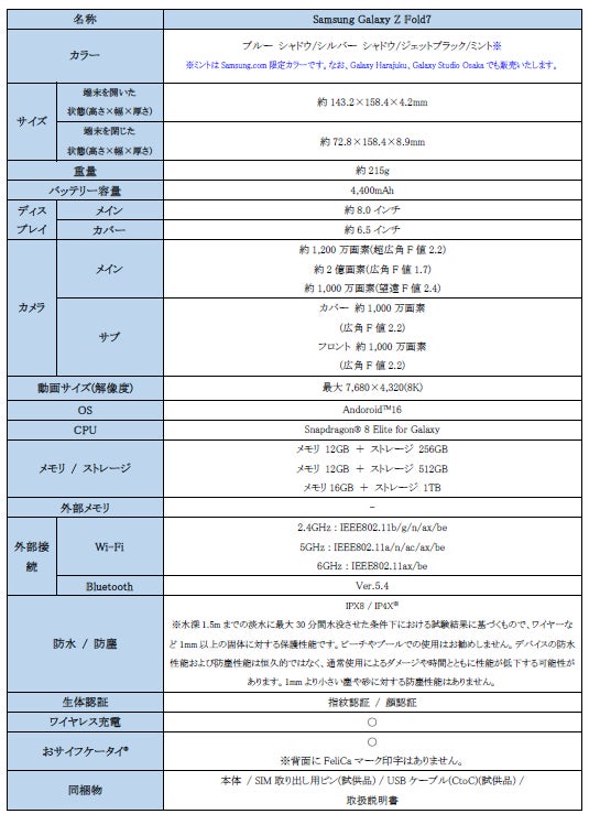 <主な仕様 : 「Samsung Galaxy Z Fold7」 (SIMフリーモデル)>