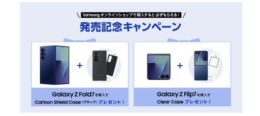 対象期間中、Samsungオンラインショップ(https://www.samsung.com/jp/offer/)、Samsung Galaxyブランドショーケース「Galaxy Harajuku」(東京・原宿)、「Galaxy Studio Osaka」(大阪・なんば)にて、「Samsung Galaxy Z Fold7」(SIMフリーモデル)を購入すると、特典として「純正・専用アクセサリー」をプレゼントいたします。また、「Samsung Galaxy Z Flip7」(SIMフリーモデル)も購入キャンペーンを実施いたします。併せてご確認ください。
